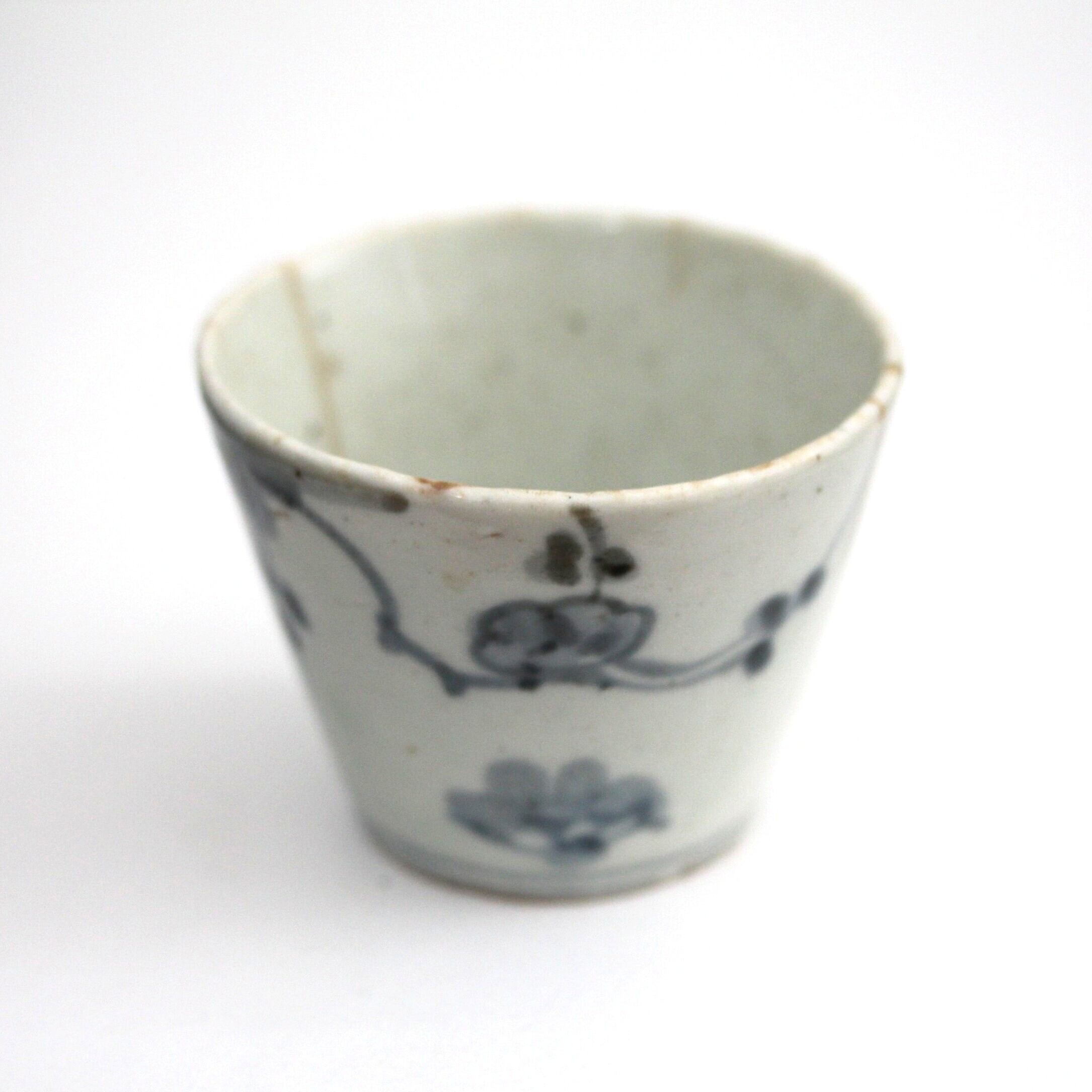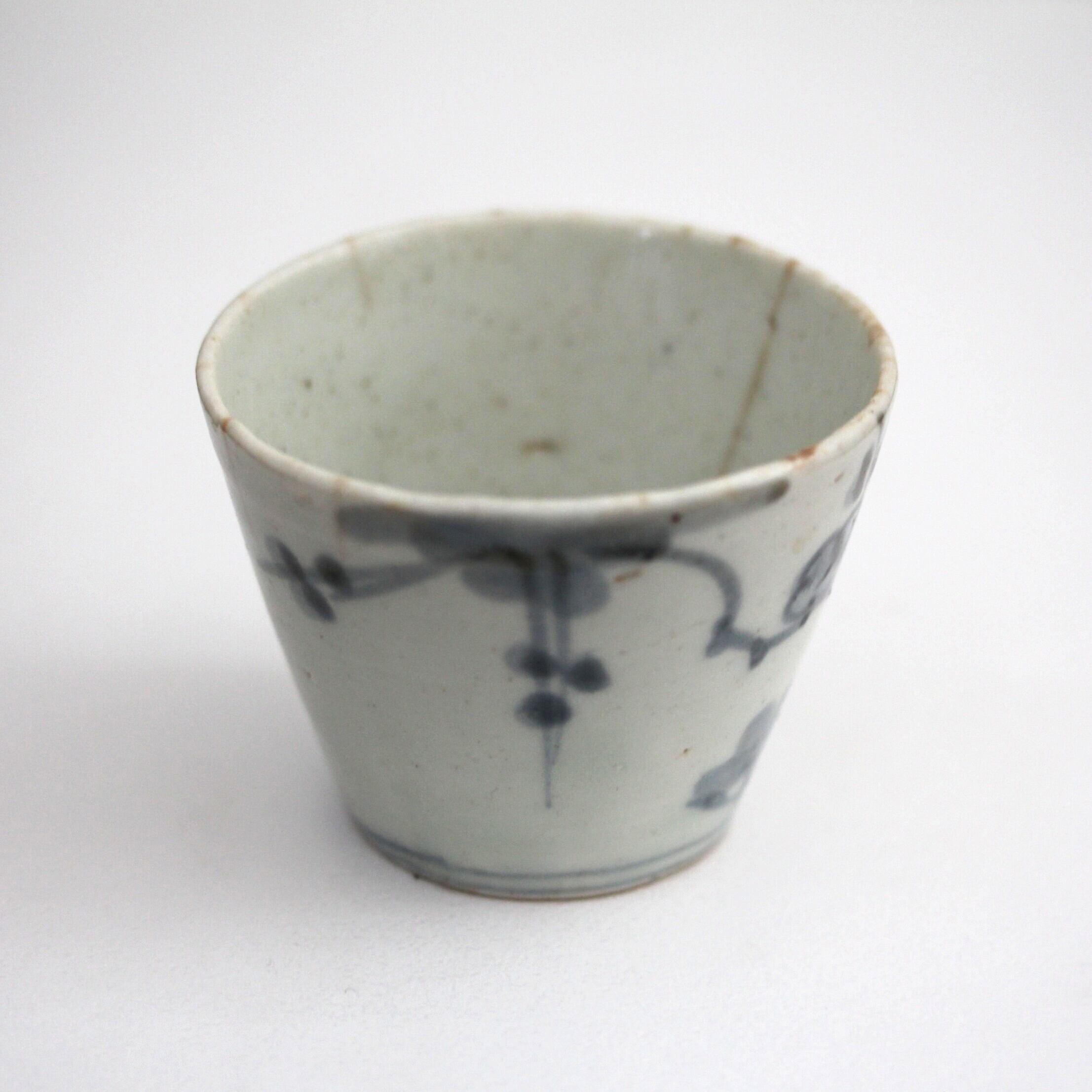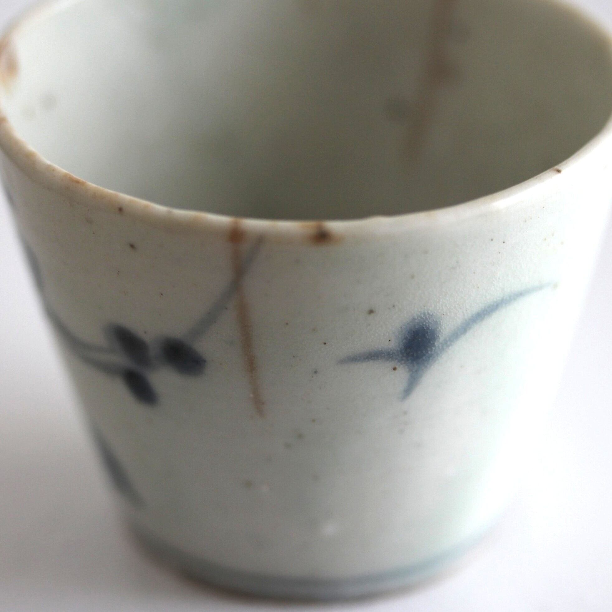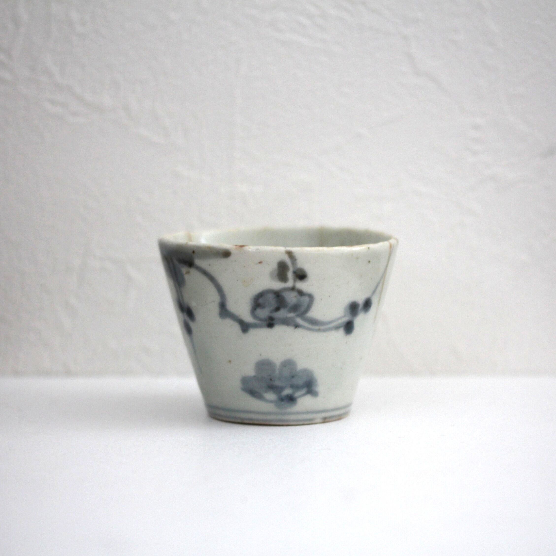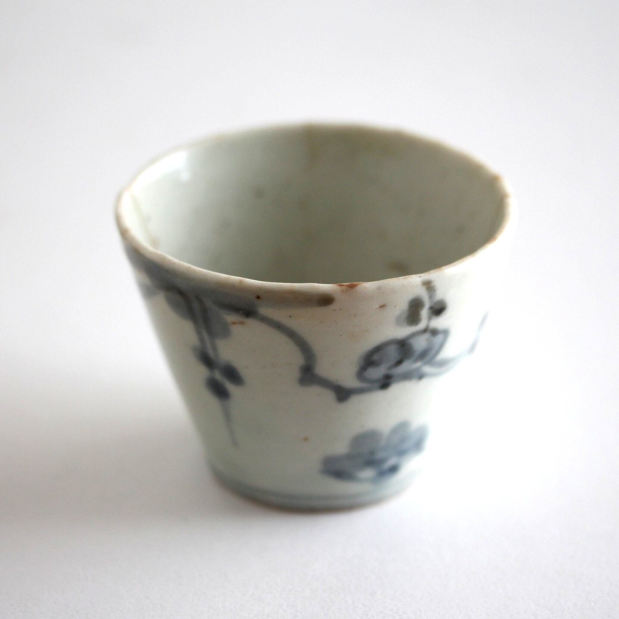 A charming blue and white porcelain sobachoko cup, with design of plum blossoms.