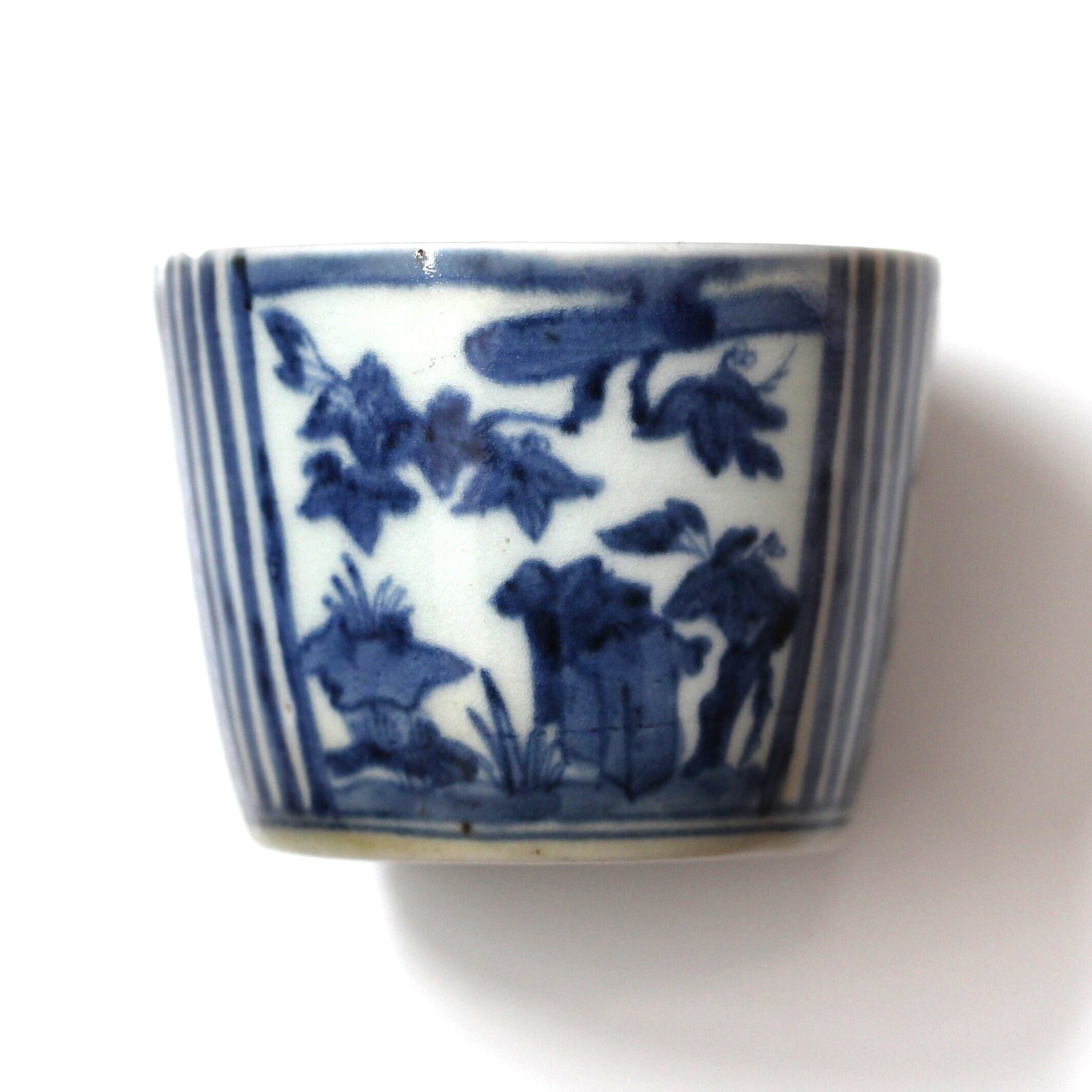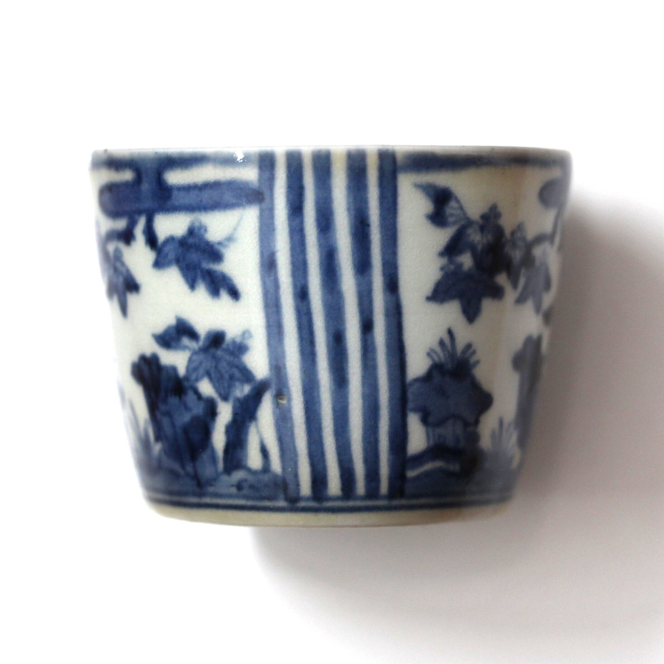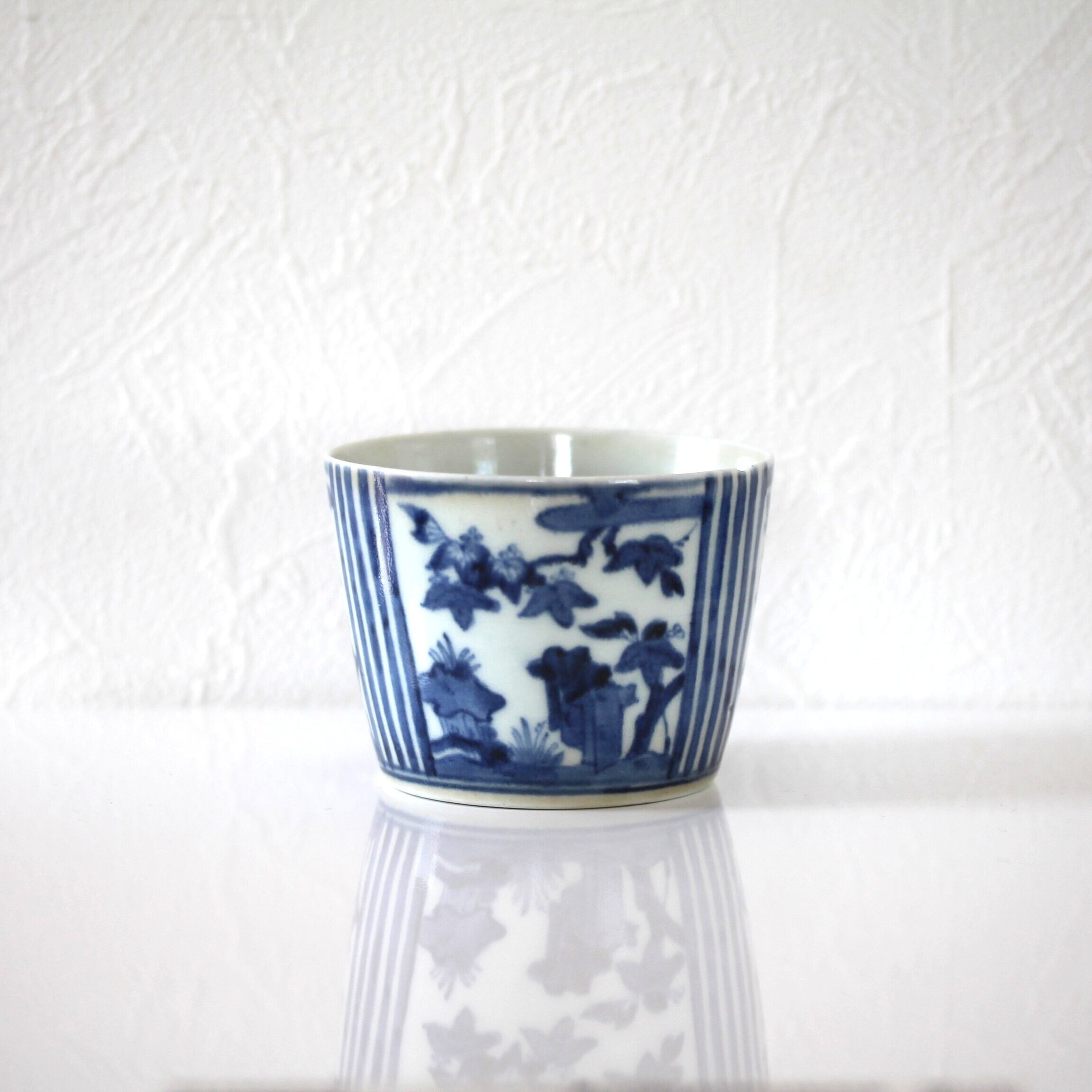 古伊万里染付桐縦縞文猪口 d8.8cm Imari Blue and White Cup, Paulownias Design and Vertical Stripes 18th C