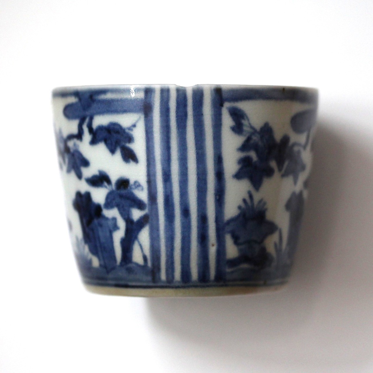 A charming blue and white sobachoko style cup, with paulownias design and vertical stripes pattern.