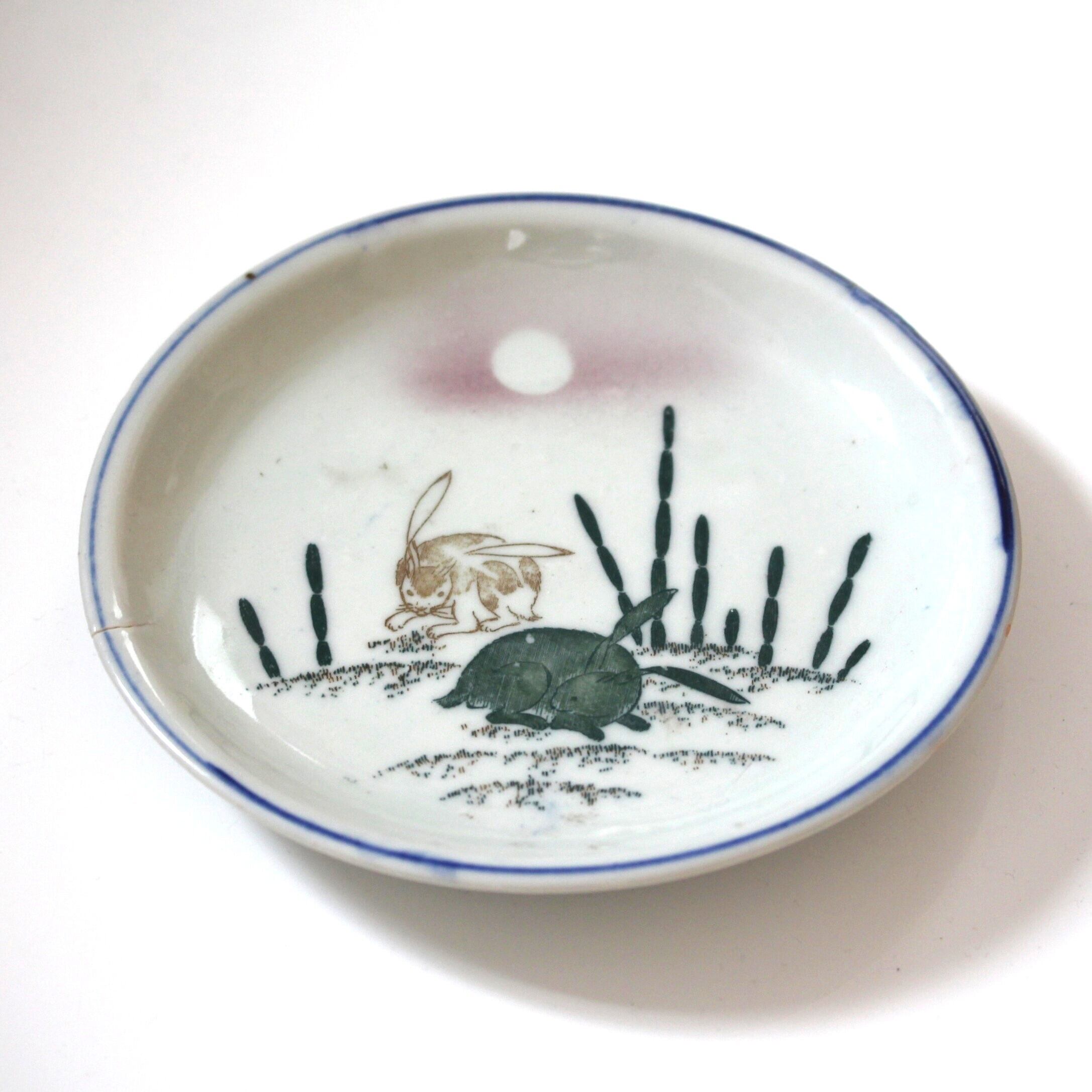 A charming inban transfer ware plate with design of rabbits on tokusa horsetail field under the moon.