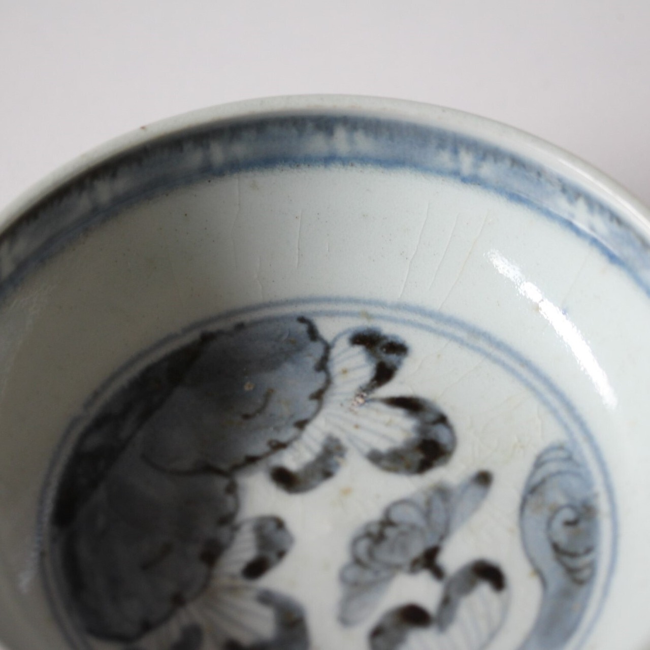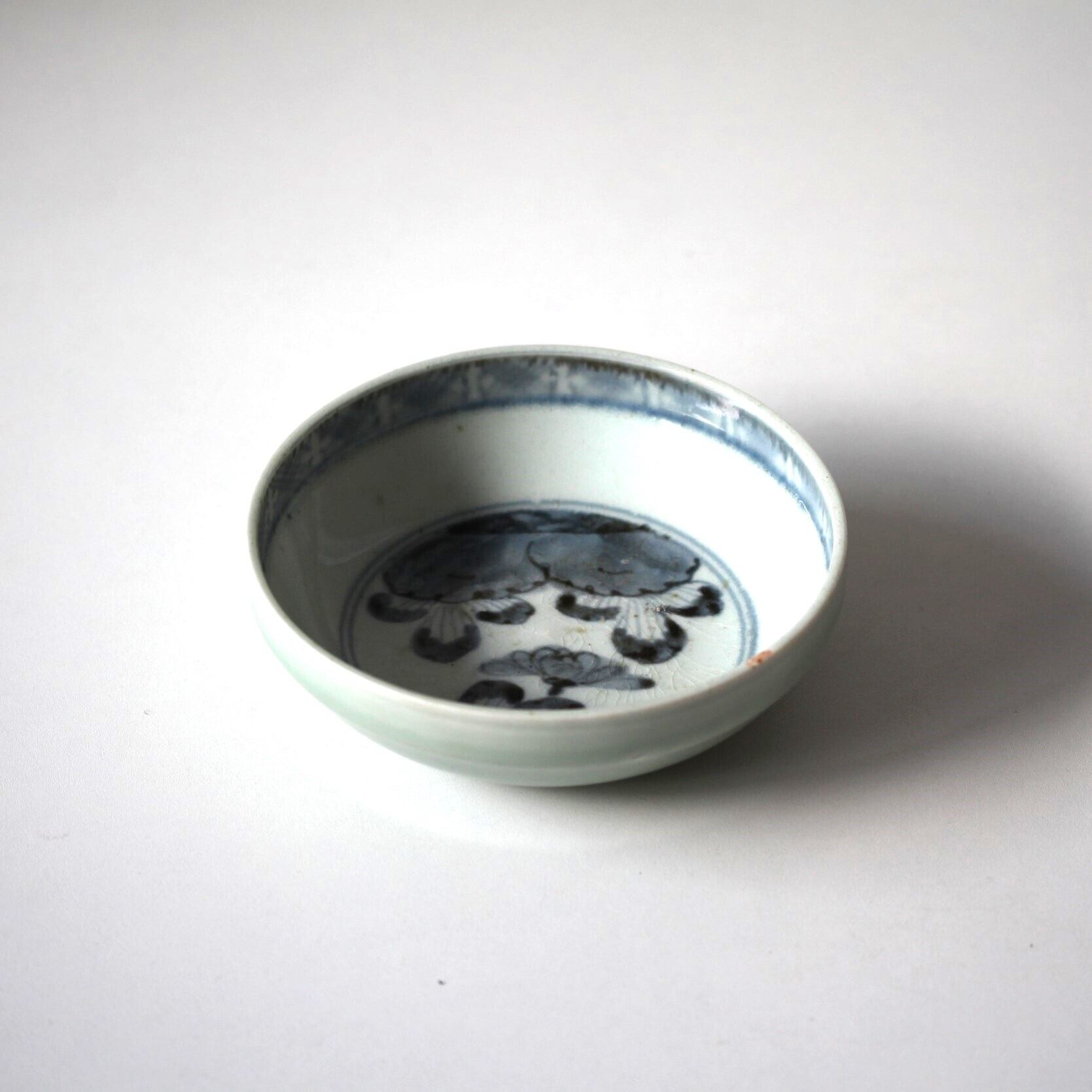 古伊万里青磁染付菊流水文独楽形深皿 d14.5cm Imari Celadon Glazed Blue and White Bowl, Design of Chrysanthemums and Water Stream 18th C | HANAFUDA