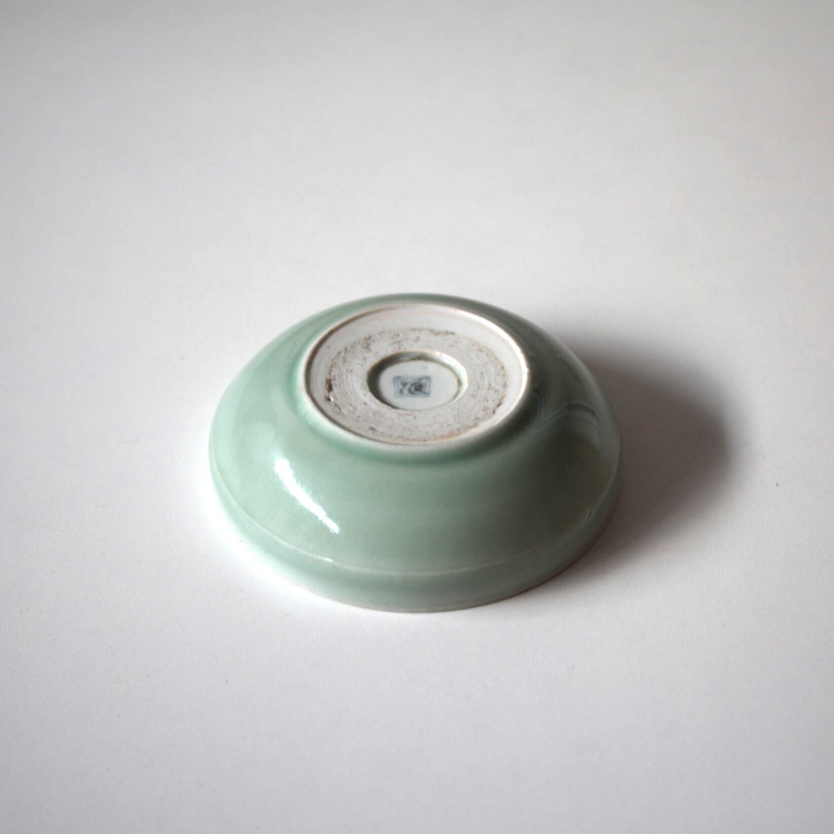 A charming porcelain bowl with celadon glaze outside. Inside with design of chrysanthemums and waves or water stream, in underglaze blue, which is one of a traditional design in Japan.