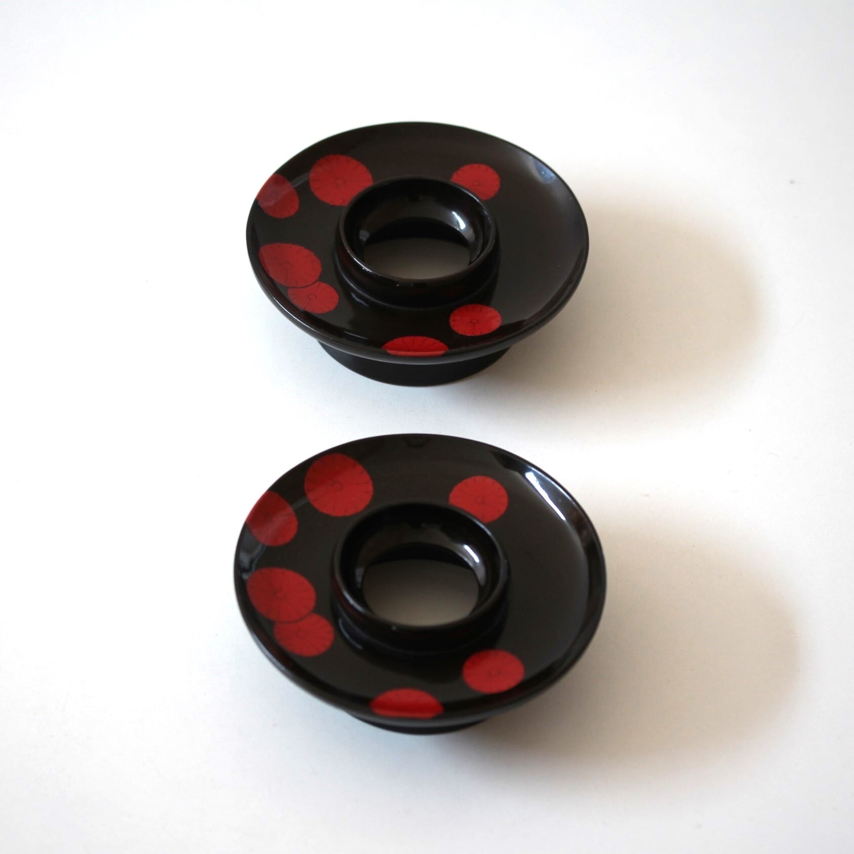 A pair of charming black lacquered stands, for tea bowl or tea cup, with chrysanthemums design in red lacquer.