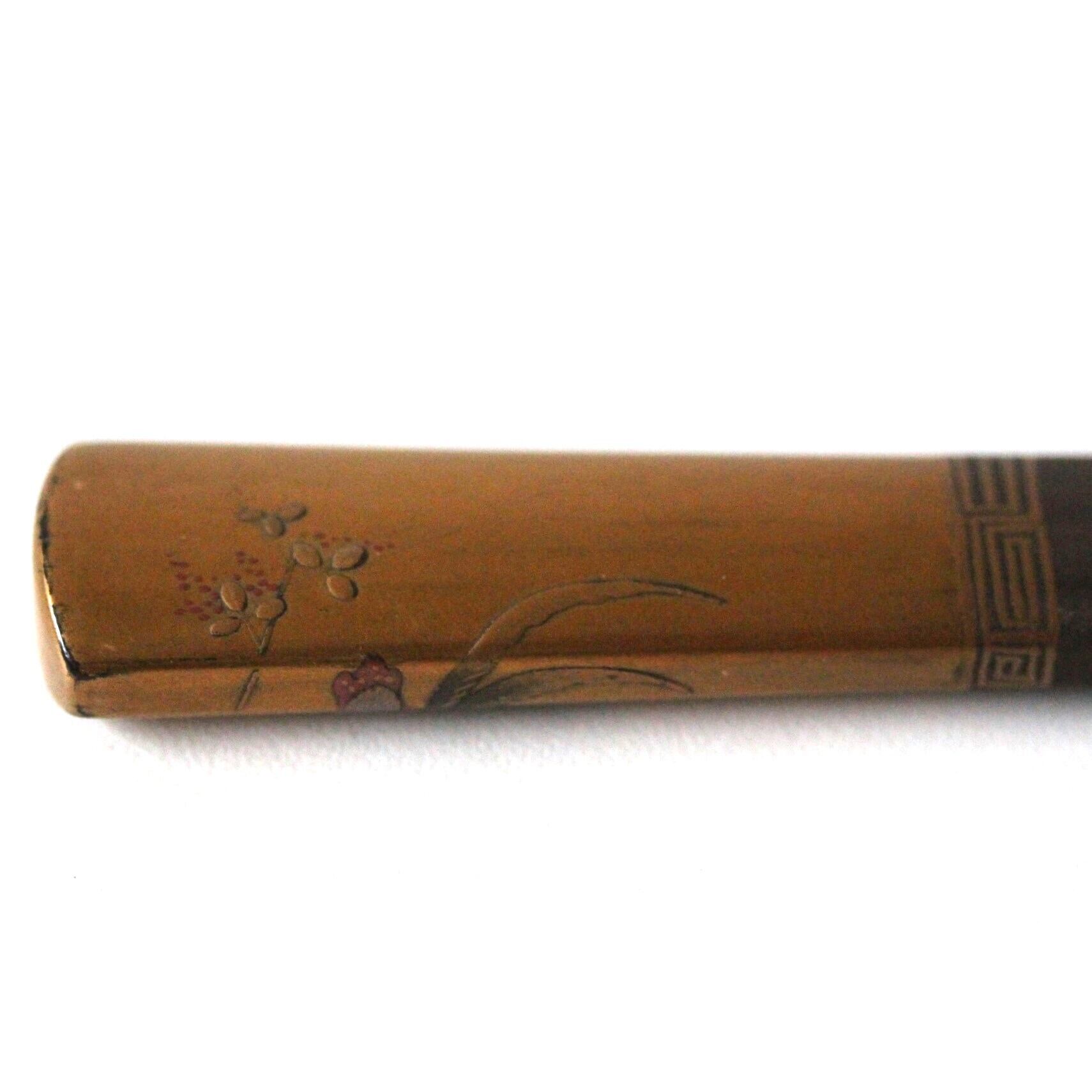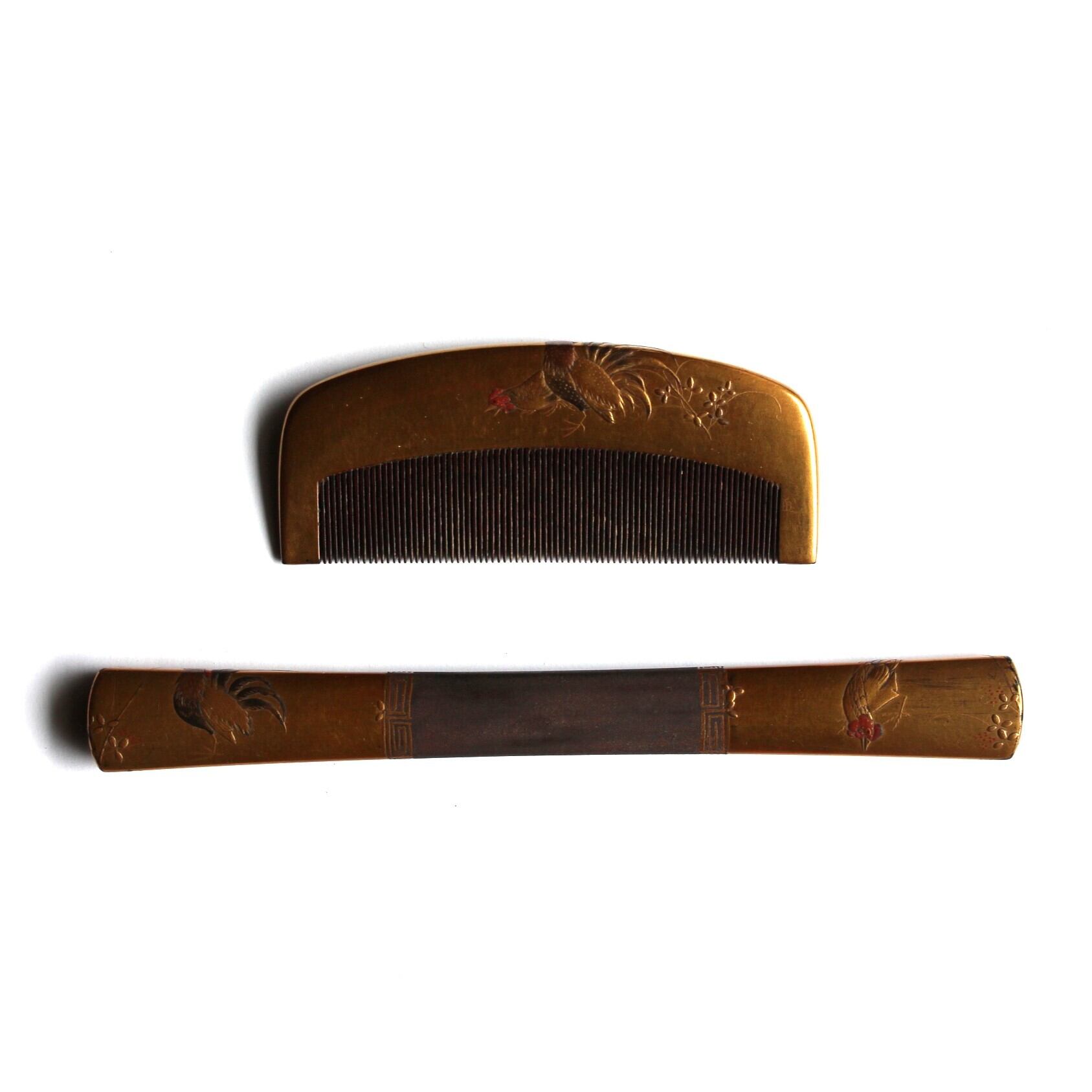 萩に鶏蒔絵櫛・笄 l14.3cm Set of Lacquered Wooden Kushi Comb and Kogai Hairpin, Design of Hagi Bush Clovers and Chickens in Gold Makie 19th-20th C | HANAFUDA