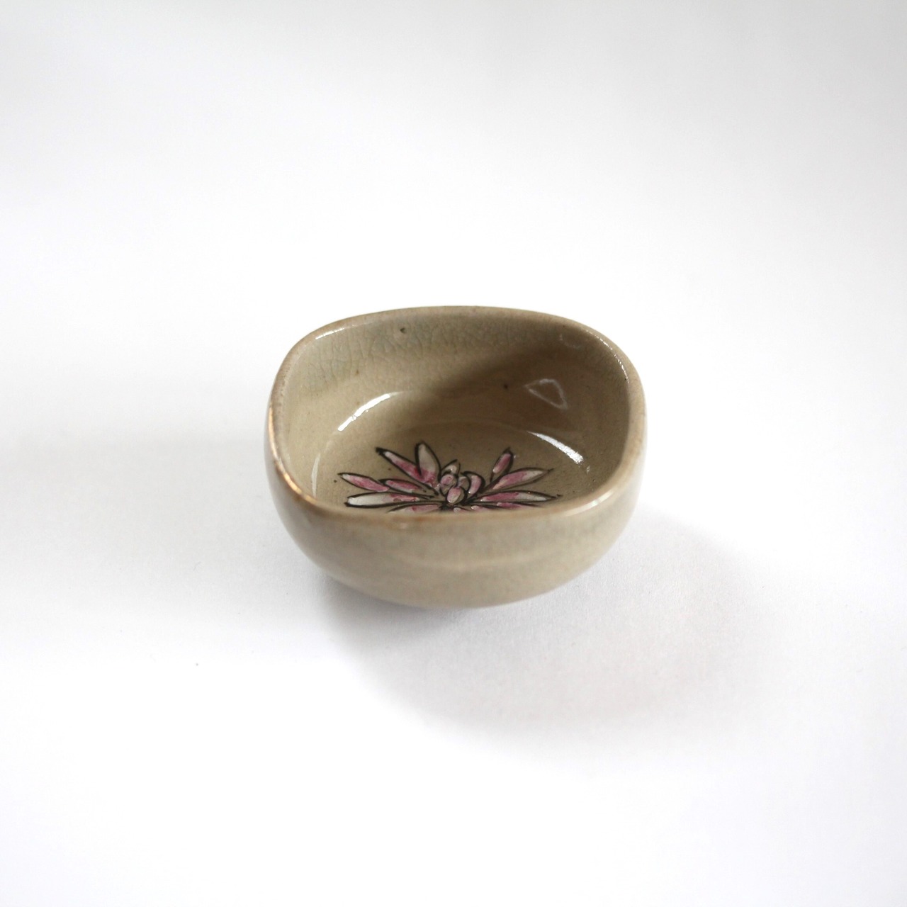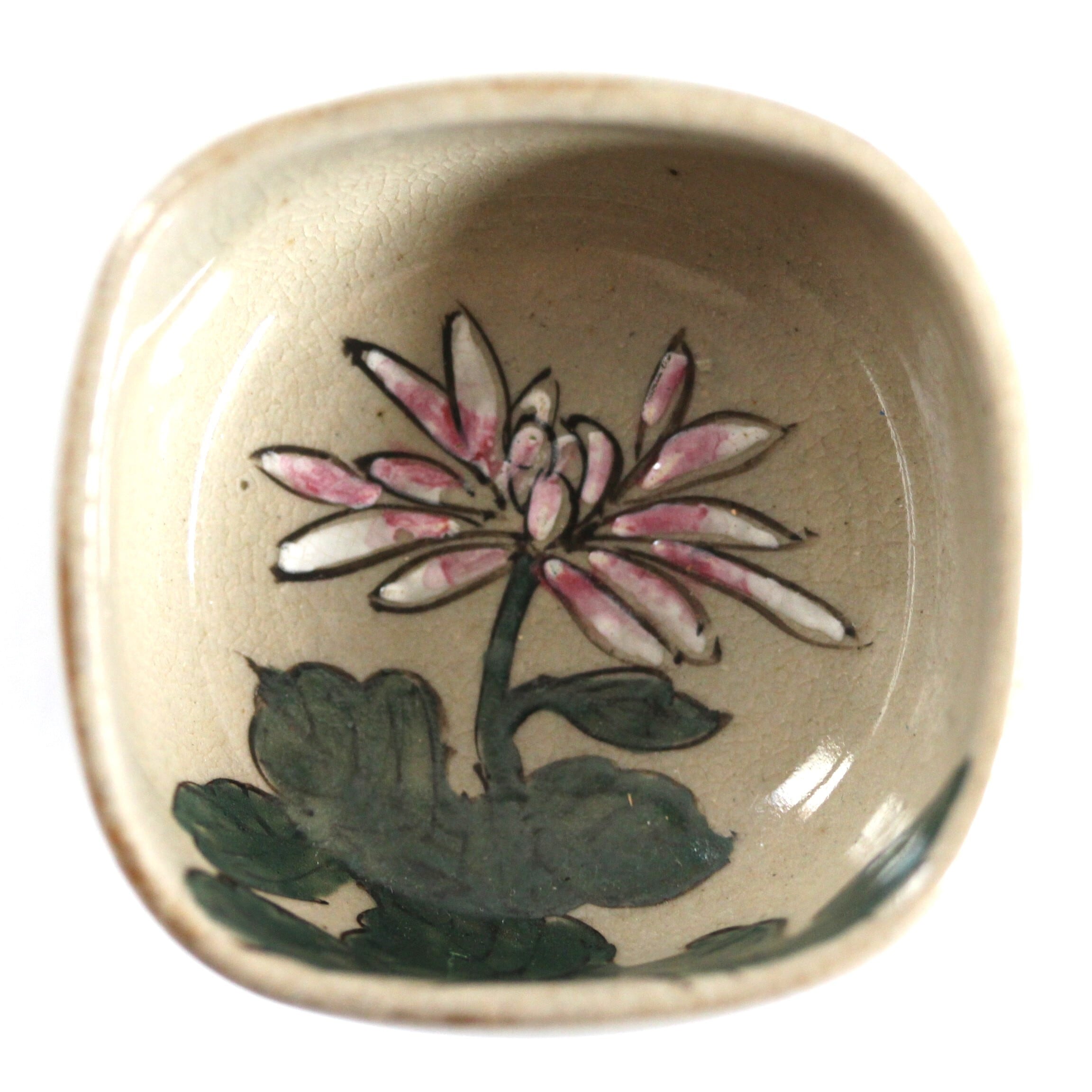 A charming square ceramic cup with enameled chrysanthemum design.